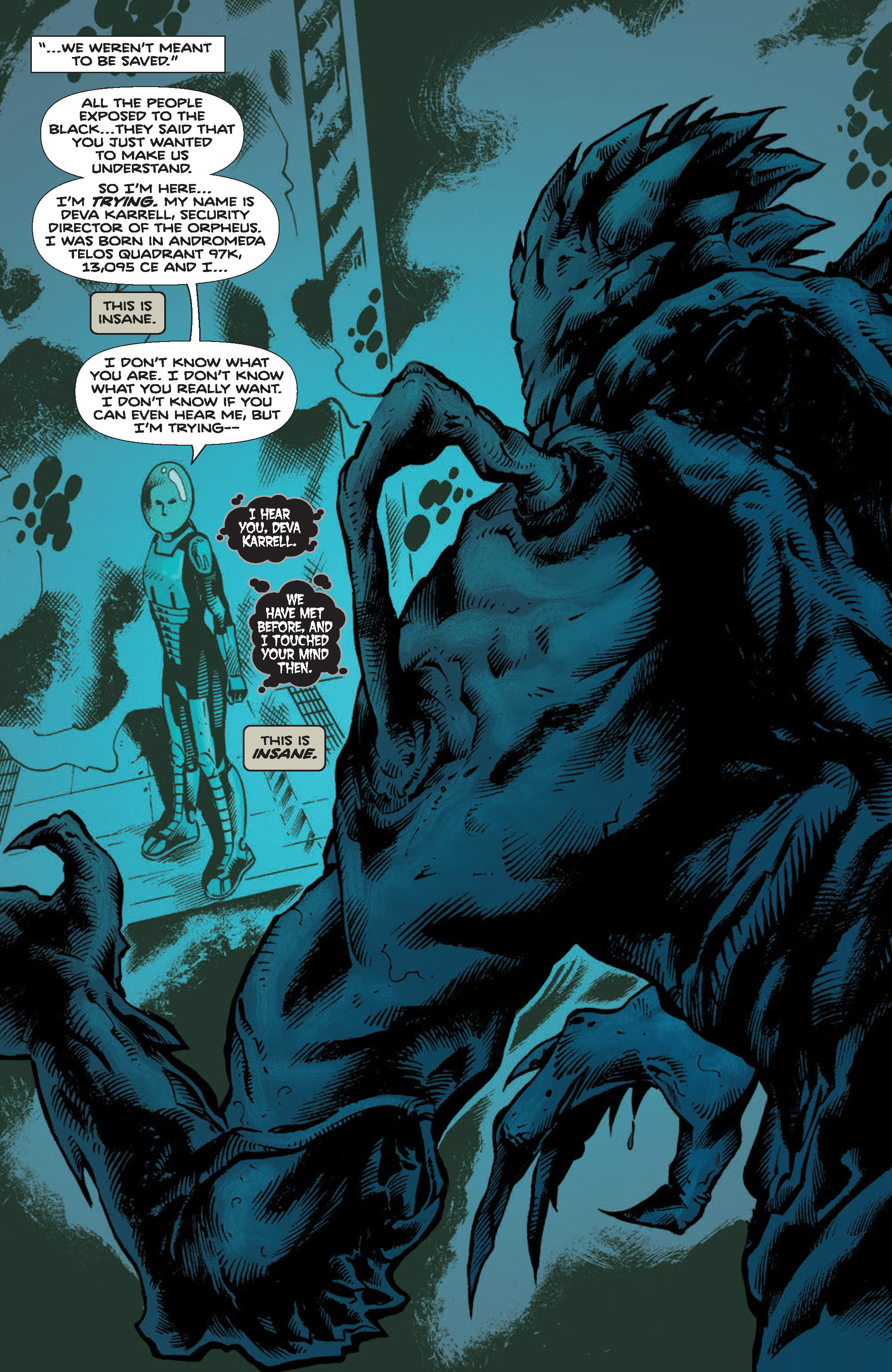 It’s everyone’s life on the line as Deva Karrell comes face-to-face with the Entity from beyond and learns the terrible truth behind the Orpheus’ recent deaths.