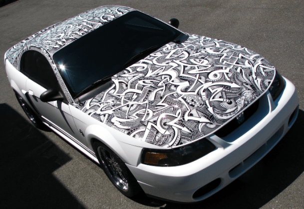 Artist Chris Dunlop uses black Sharpie markers to draw designs on his 1999 Ford Mustang GT.