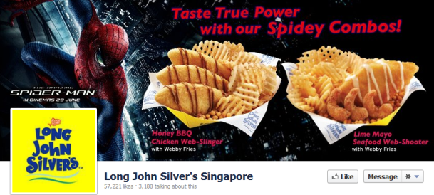 Long John Silver’s in Singapore kicks-off their Spider-Man movie tie-in with these “marvelicious” dishes. There is the Honey BBQ Chicken-Slinger with Webby Fries or Lime Mayo Seafood Web-Shooter with Webby Fries.